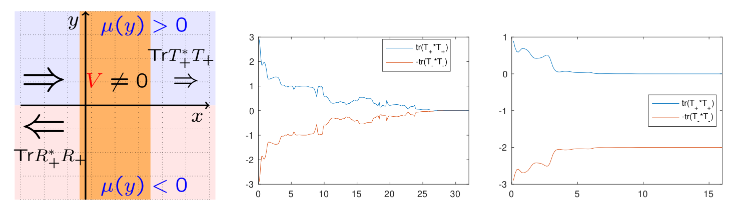 The results mentioned above involve continuous partial (or pseudo) differential models in the Euclidean plane. Because the dual/reciprocal space is itself the Euclidean plane, and hence unbounded, standard constructions of invariants on compact manifolds, such as Chern numbers or winding numbers, do not apply in general. The paper Continuous bulk and interface description of topological insulators [B. J. Math. Phys. 2019] revisits this question specifically for bulk and interfaces TIs modeled by systems of Dirac equations in Euclidean spaces of arbitrary dimension. Using notions of Fredholm modules introduced in earlier works by Atiyah and Connes and used in the context of topological phases in theories of the Integer Quantum Hall Effect by Bellissard and Avron-Seiler-Simon, Dirac systems are mapped to Fredholm operators by spectral calculus. The resulting index is then shown to be stable against classes of random perturbations using standard tools in functional calculus and the Helffer-Sjöstrand formula.In order to model asymmetric transport for more general models than Dirac systems, we first need a physical observable that characterizes such transport. The following observable, first introduced in work by Schulz-Baldes and collaborators and work by Graf and collaborators, is now ubiquitous, in a form or another, in mathematical analyses of edge transport: \[ \sigma_I = {\rm Tr} \ i[H,P] \varphi'(H). \] Here, \(H\) is the Hamiltonian of interest, \(P=P(x)\) is intuitively a function equal to \(1\) for \(x>x_0\) and equal to \(0\) otherwise (the plane is parametrized by \((x,y)\)). The operator \(i[H,P]\) then affords an interpretation as a current operator (amount of signal propagating from the left to the right of the line \(x_0\) per unit time). The function \(\varphi'(H)\geq0\) and integrating to \(1\) should be interpreted as a density of states selecting an energy (or frequency) range of excitations that cannot propagate into the insulating bulks. Thus, \(\sigma_I\), with \({\rm Tr}\) operator trace on \(L^2\), is the expected value of the operator \(i[H,P]\) for the density of states \(\varphi'(H)\geq0\). It turns out that \(\sigma_I\) is quantized in many settings of interest. Moreover, if \(I^N\) and \(I^S\) are two bulk invariants associated to the two insulators north and south of the interface \(\{y=0\}\), then the Bulk-Edge Correspondence states after appropriate orientation that \[ 2\pi \sigma_I = I^N-I^S \in {\mathbb Z}. \] The bulk edge correspondence is a central principle in the physical interpretation of topological insulators. Its derivation remains difficult independently of the context in which it applies. Most works on the bulk-edge correspondence in fact relate edge transport along a boundary to the bulk invariant in the volume (say \(I^N\) with then \(I^S\) set to \(0\)). It has been derived rigorously mathematically in many discrete settings, using either algebraic K-theory techniques generalizing Belissard's original work or more analytical techniques generalizing the Avron-Seiler-Simon theory. It was also generalized to continuous settings where bulk invariants are naturally defined.